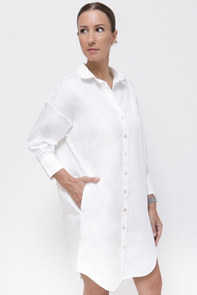 Poplin gömlek elbise formu, temiz beyaz rengi ve logo nakış detayıyla şehir stiline modern bir dokunuş katar.